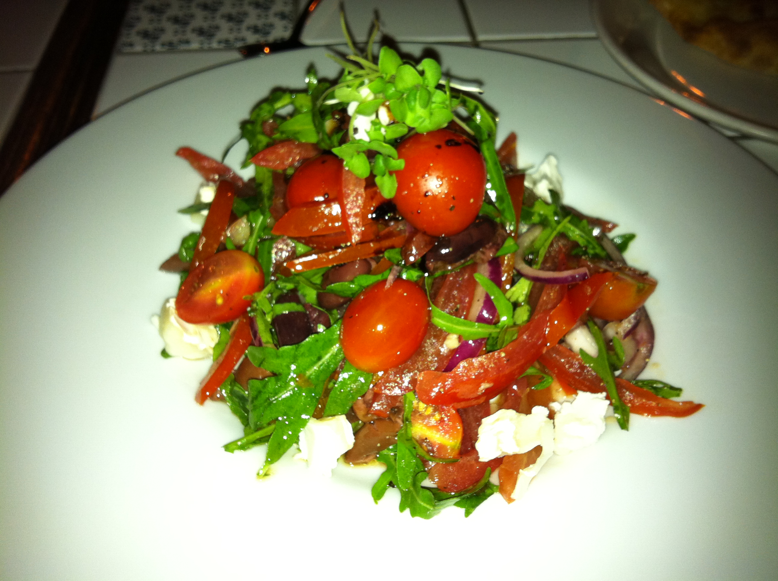 (42 ₪)  סלט עגבניות וגבינת עיזים עם עגבניות שרי, עגבניות מיובשות, אורוגולה, וזיתי קלמטה