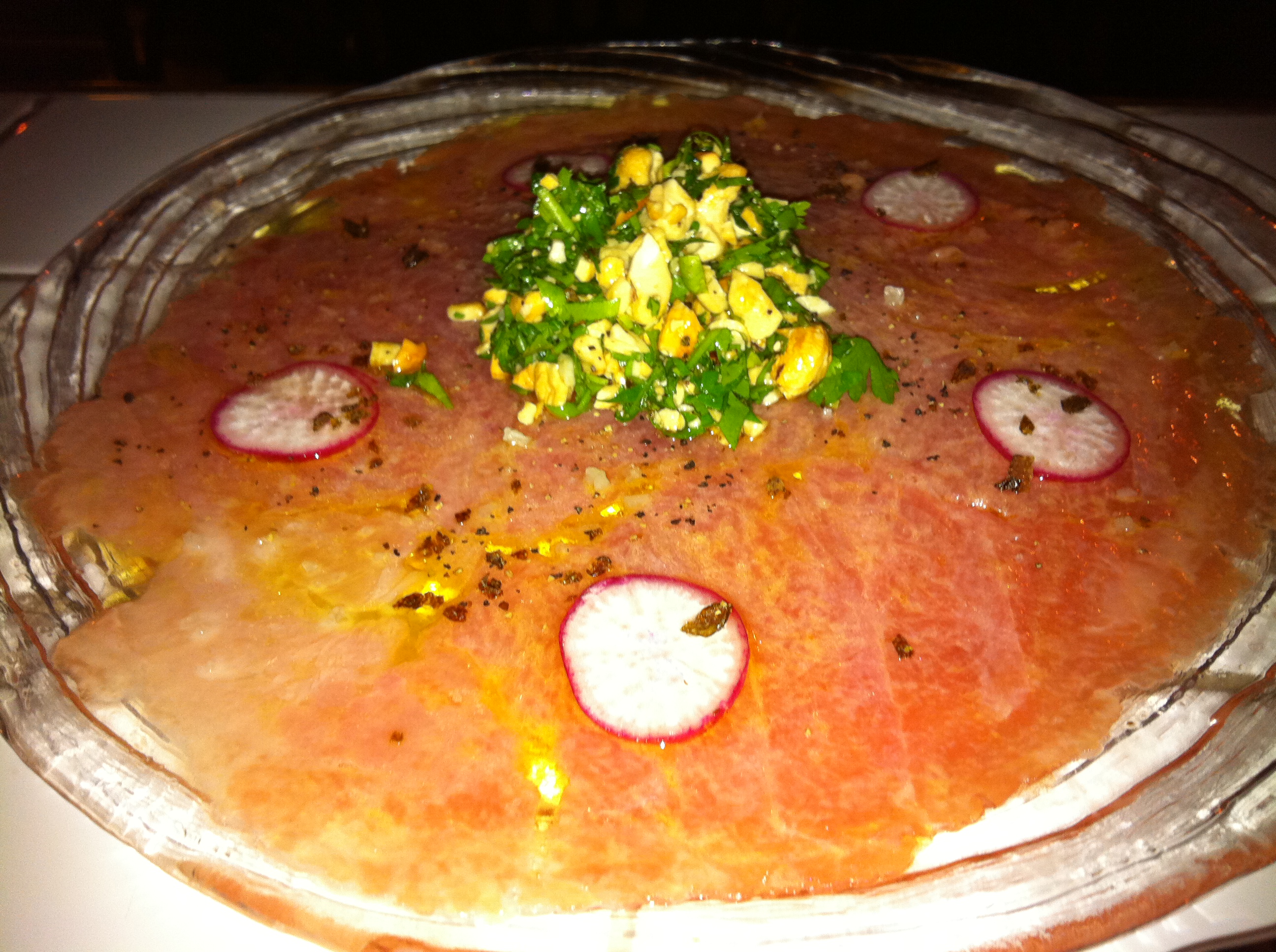 (48 ₪) קרפצ'יו טונה אדומה מעוטר בסלט ירוקים עם קשיו וחמוציות
