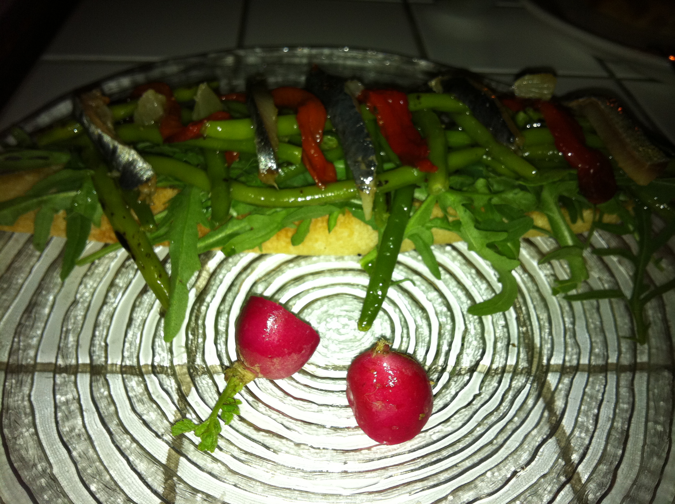 (34 ₪) ברוסקטה עם סרדינים כבושים, עלי אורוגולה ופלפלים קלויים