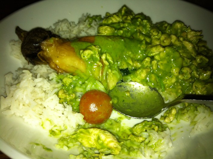 עוף בקארי ירוק וחציל קלוי – המנה הזאת הייתה קצת חריפה בשבילי, אבל שותפתי לארוחה נהנתה ממנה מאוד.