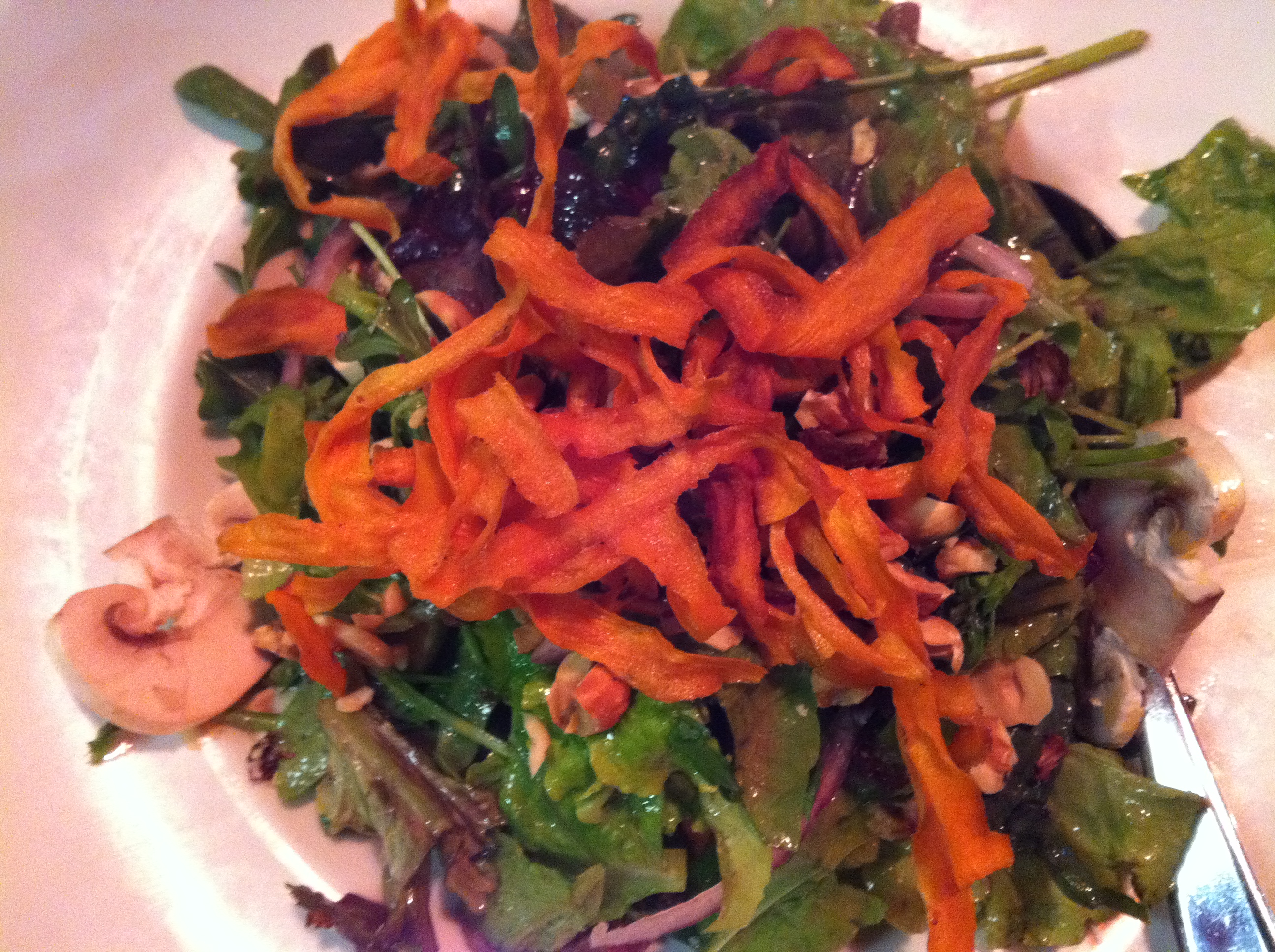 סלט מצוין המכיל עלים, פטריות, אגוזים ורצועות בטטה קריספית