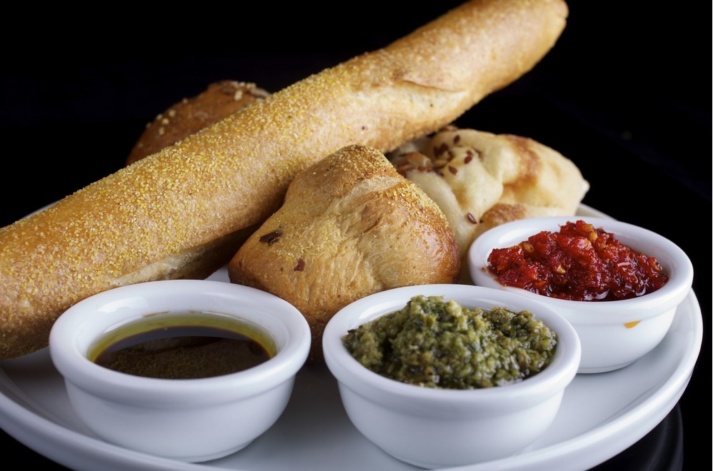 את הארוחה פתחנו עם לחם ומטבלים – שלושה סוגי לחם מלווים בטרפנד זיתים, עגבניות מיובשות ושמן זית ובלסמי. פתיח חביב.