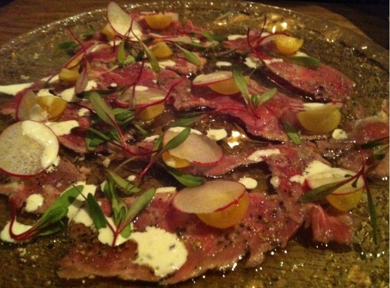 קרפצ'יו בקר – פרוסות סינטה צרובה, עלי רשד, איולי חזרת, צנונית, שמן זית. די סטנדרטי…