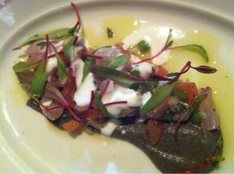 טרטר דג ים – חציל מושחר, אספרגוס, עגבנייה, עירית, צ‘ילי, לימון, שמן זית ויוגורט. מנה מעולה! דג טרי עם שלל טעמים אהובים.