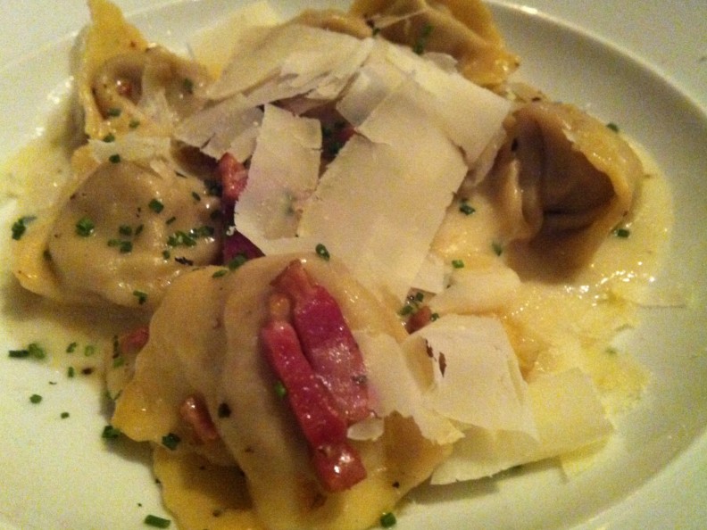 טורטליני ערמונים – פסטה ממולאת בקרם ערמונים ברוטב חמאה, מוגש על קרם ארטישוק ירושלמי ופרמג‘אן. שילוב של מרכיבים טעימים וטריים. מנה נהדרת.