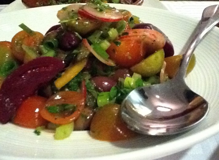 סלט עגבניות ים תיכוני – עגבניות שרי, זיתי טאסוס, שבבי צנוניות ,קוביות ארטישוק חמצמץ, לימונים כבושים ,בצל ירוק, פטרוזיליה ,פלפל חריף וסלרי קצוץ בלימון סחוט ושמן זית.