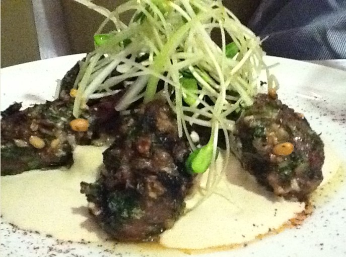 סיגרים פריכים במלית שקדי עגל קצוצים אריסה ,כוסברה ולימונים כבושים מונחים על קרם אריסה וטחינה לבנה.