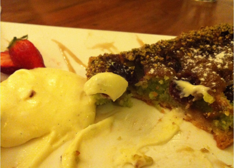 פאי ממולא בפיסטוקים בליווי קרם פטיסיאר – פה באמת מדובר במשהו מיוחד שלא נתקלים בו בכל מקום…טעמים מעניינים, שילוב של פיסטוקים, דובדבנים, קרם פטיסאיר ובצק פריך ומשובח.