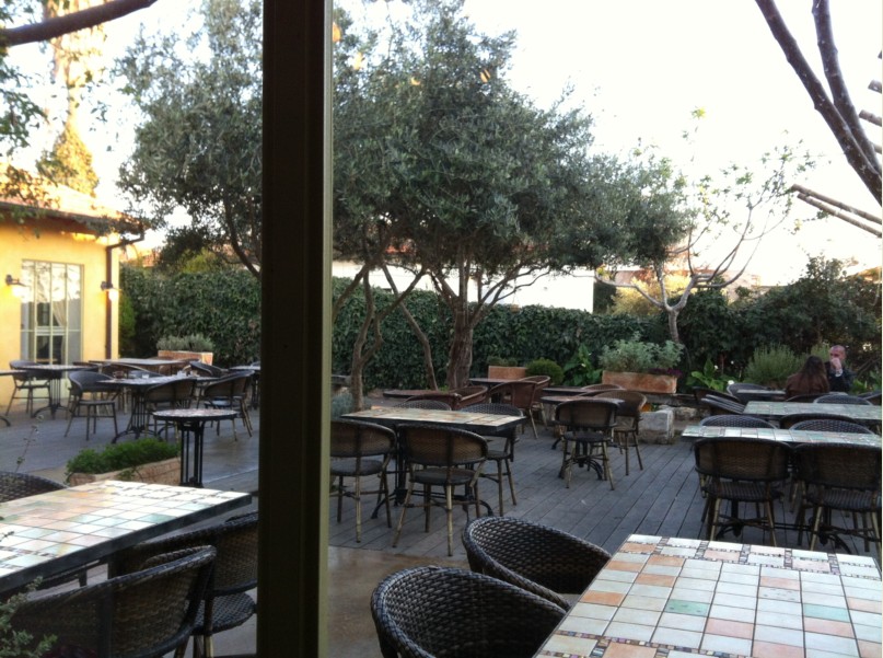 אפשר לשבת במרפסת מרובת הצמחיה בחוץ, אך מכיון שהגענו בשעות ערב הקרירות, העדפנו לשבת בפנים והסתפקנו בלראות את נוף המרפסת מהחלון בפנים.