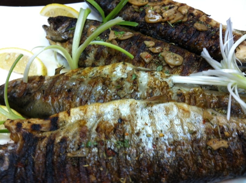 פורל טרי צלוי על גריל פחמים בשמן זית ושבבי שום כבוש