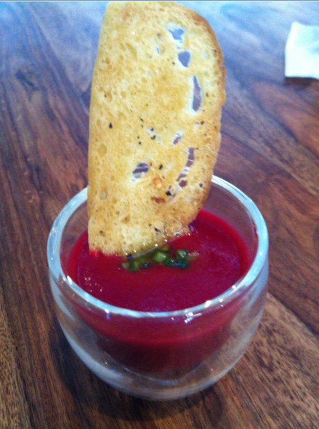 - מרק סלק קר מוגש עם פסטו שמיר, טפטוף שמנת חמוצה וסיגר גבינות.