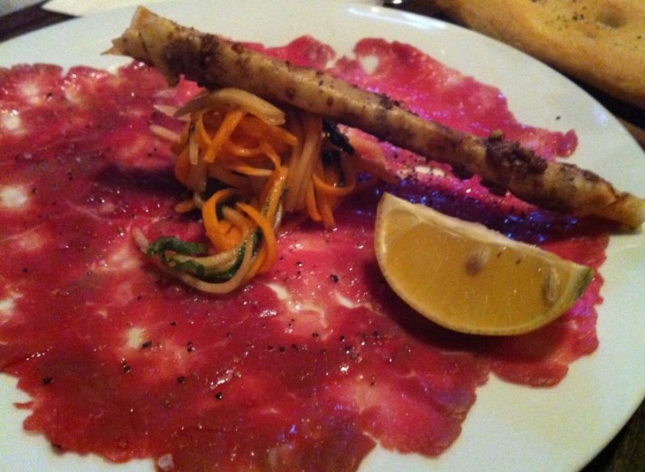 קרפצ'יו פילה בקר – משוח בשמן זית, מלח ים אטלנטי, פלפל גרוס ופירות העונה, בליווי מקל קריספי, עם אגוזים (49)