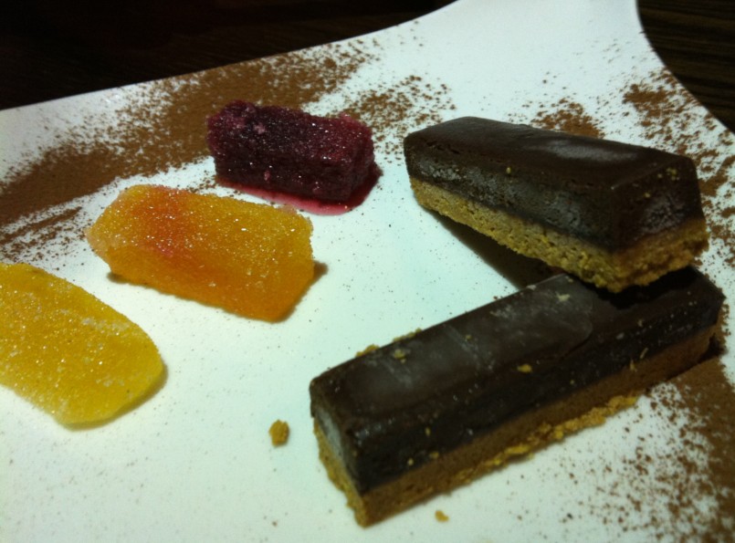 פאדג' שוקולד בליווי גלידת וניל, אצבעות שוקולד עם שלושה סוגי מרמלדה וקרם ברולה קפוא ברוטב פירות יער.