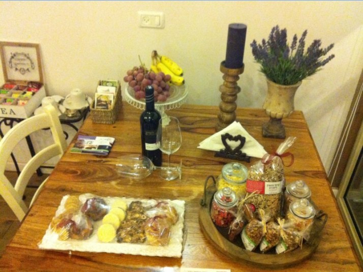 השולחן שלנו היה עמוס בכל טוב: שוקולדים, עוגות, עוגיות, גרנולה, יין ופירות. בדיוק כמו שאני אוהבת!