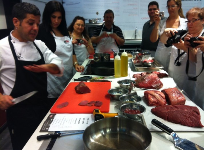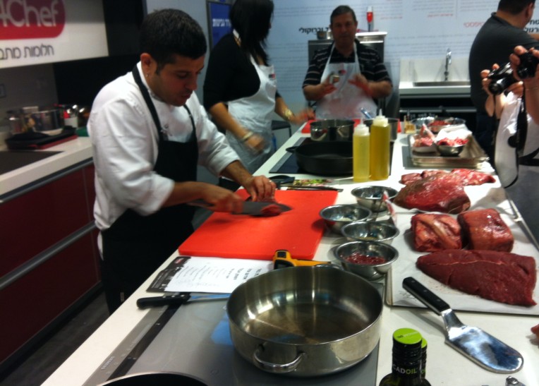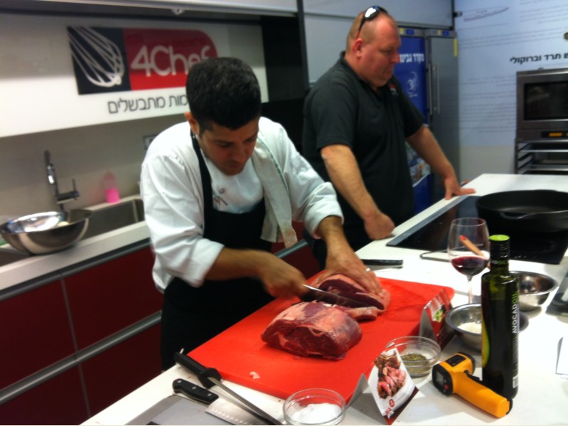 השף איתן ששון הדגים לנו איך צריך לחתוך את הבשר על מנת שייצא דק דק.
