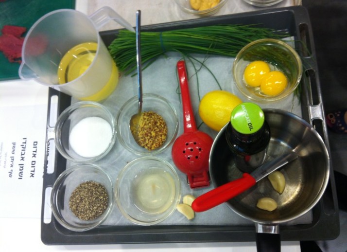 - מוסיפים את השמן בזילוף עד למרקם הרצוי