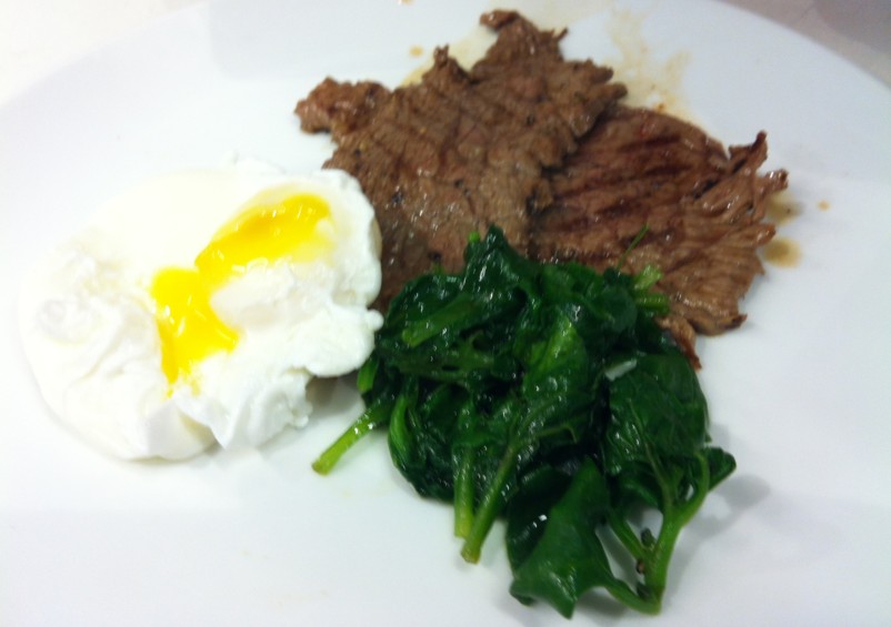 סטייק & EGGS – "שפיץ צ'אך" דק/"מינוט" עם תרד "פלורנטין" וביצה עלומה