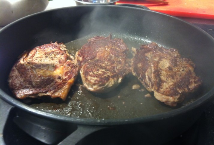 - עם מעט מאד שמן "סוגרים" את הבשר במחבת כבדה לוהטת עד להשחמה מכל הצדדים