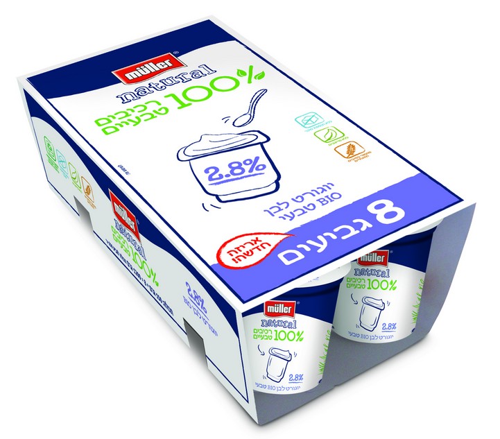 מחלבת Müller מציעה לצרכני הקטגוריה את היוגורט הלבן היחיד מ 100% רכיבים טבעיים (בהשוואה ליוגורט לבן של המתחרים המובילים), ללא חומרים משמרים, ללא מייצבים וללא צבעי מאכל מלאכותיים ועכשיו גם באריזת מאגדת של 8 גביעי יוגורט.