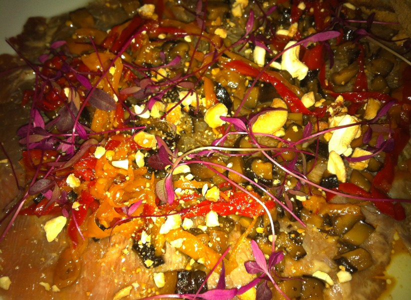 קרפצ'יו בקר – סוכריות שיטאקה, פלפל פיקיו, קשיו ופוקאצ'ה פריכה