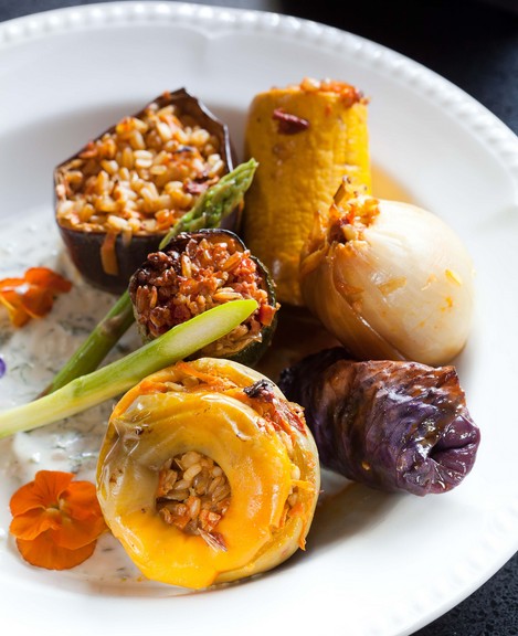 ירקות עונתיים ממולאים – בגרעיני שיבולת שועל וגוג' ברי, פריקי וטופו על מצע צשיקי של צנוניות. טעמתי רק את הקישוא ואהבתי מאוד.