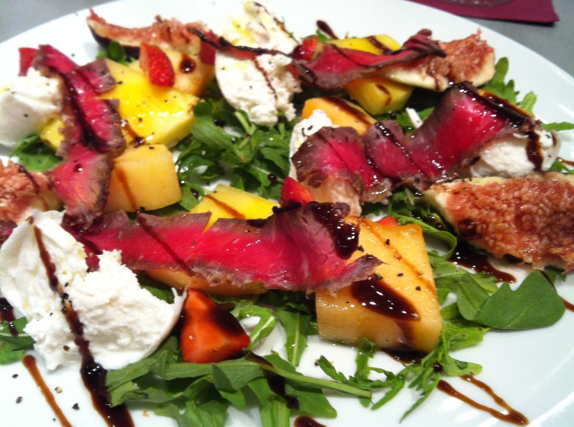 - סלט ברזאולה סינטה כבושה מוגשת עם פירות העונה, מוצרלה באפלו וארגולה 52 ₪