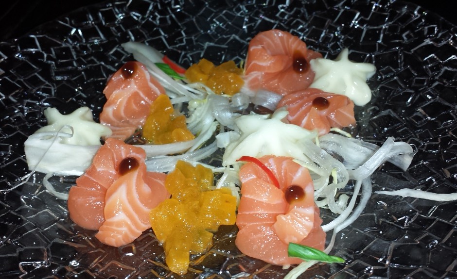 סשימי דג ים עם פודינג סויה, קציפת לימון, אנדיב, אפרסמון וצ'ילי טרי. משחק מעניין של צבעים וטעמים.