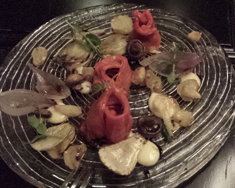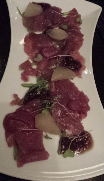 קרפצ'יו סינטה עם קרם סלק, שעועית ירוקה, שאלוט, אגסים וטפיוקה בלסמי.