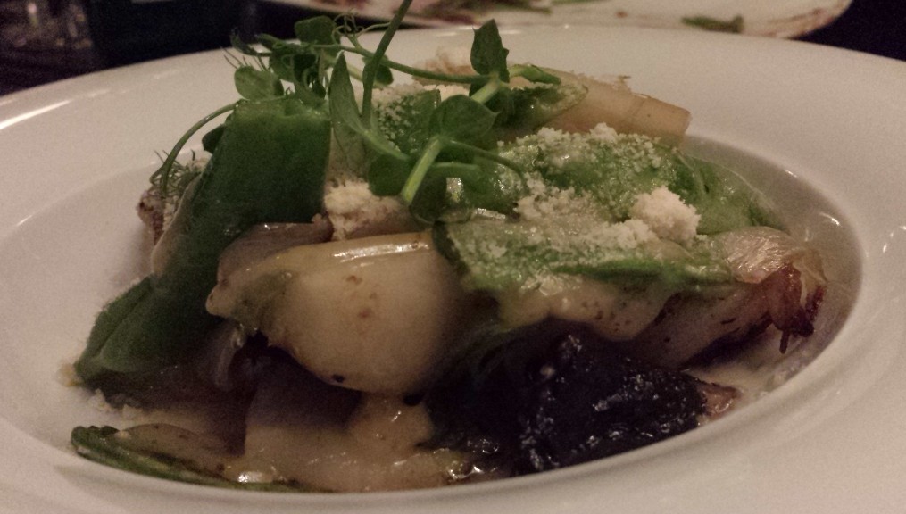 סלט פורטבלו חם עם אפונת שלג, אנדיב, לפת ושומר בקרם שום עדין וגרמולטה שקדים. סלט שכולו תענוג לחיך.