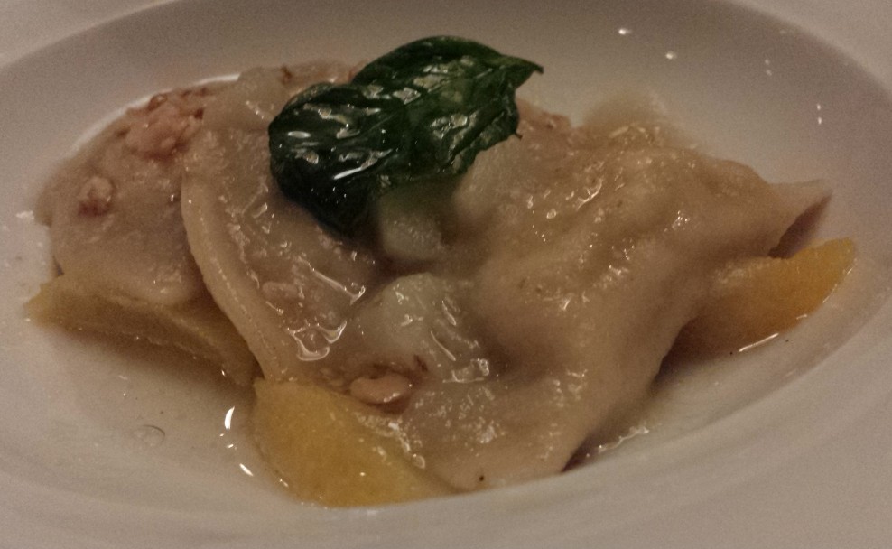 רביולי סלמון בקרם שומר, סלסה של אגוזים, שמן כמהין ולימון, עם מרווה פריכה ותפוזים. לחובבי טעמו העז של הסלמון.