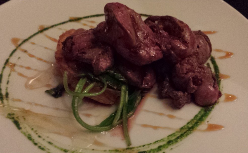 כבדי עוף צלויים על חצי בריוש עם קרם בננות, קרמל וניל ופטרוזיליה. כבדי עוף אף פעם לא נמנים על המנות האהובות עלי, אבל החברות מסביב אהבו מאוד.