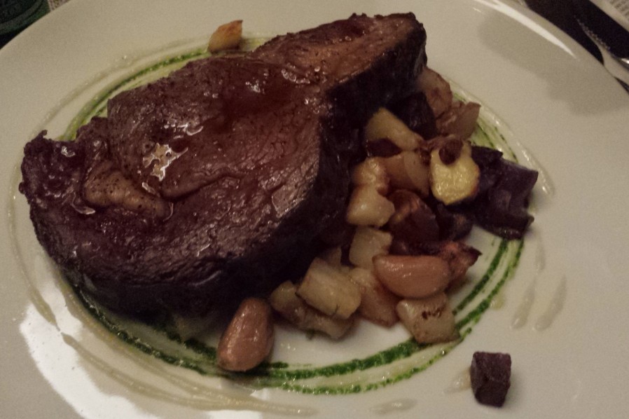 אנטריקוט עסיסי בגריל עם ראגו תפוחי אדמה, קרם שום, מרווה וציר בקר.