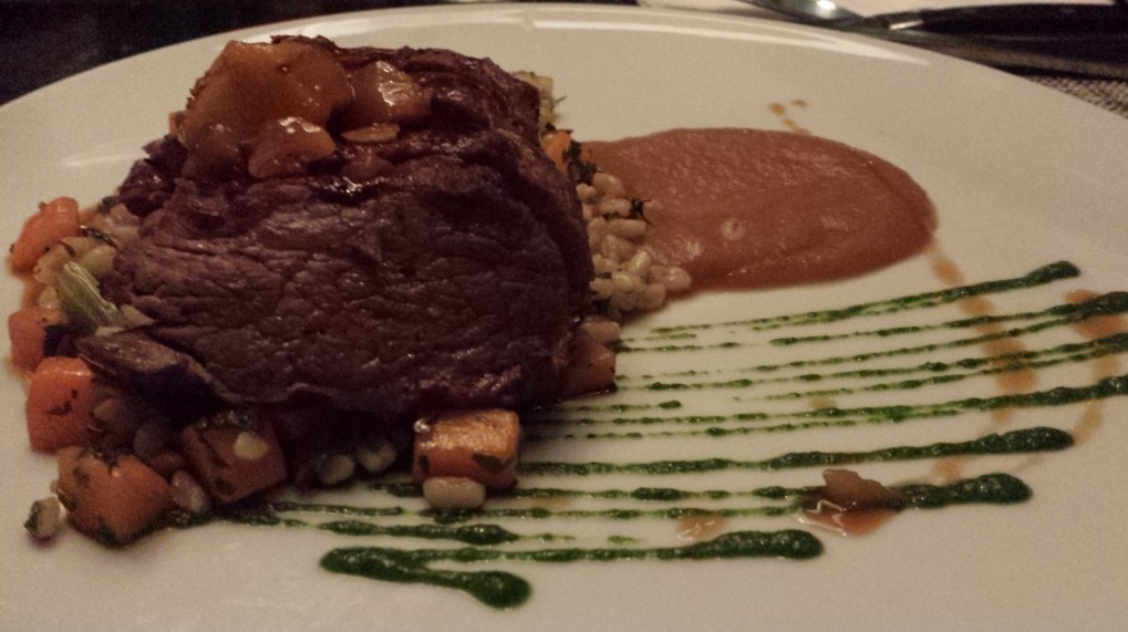 פילה בקר מובחר עם חיטה וירקות שורש, קרם בצלים מקורמלים, רוטב פטריות שחור וערמונים. למי שמעדיף את הבשר שלו פחות שומני..