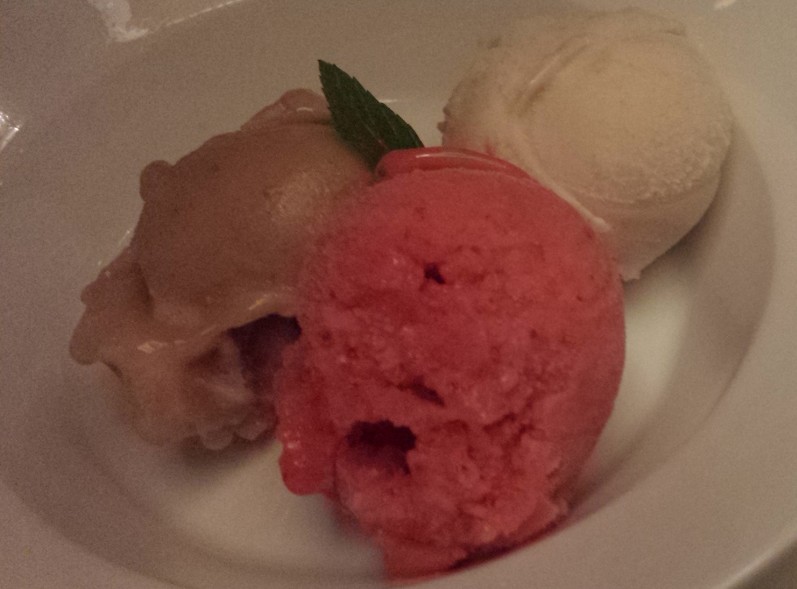 קראנץ' שוקולד, נוגט ואספרסו עם סורבה שוקולד.