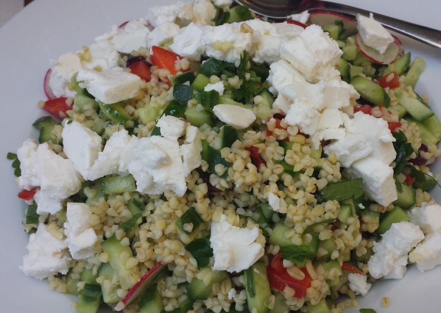 סלט בורגול מרענן עם חמוציות, פטרוזיליה, גמבה אדומה, צנונית וקוביות בולגרית.