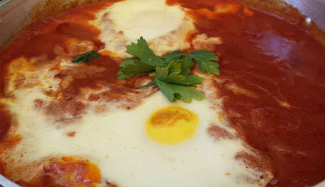 אחת שקשוקה קלאסית ואחת שקשוקת "סינייה", הכוללת חציל שלם וטחינה.