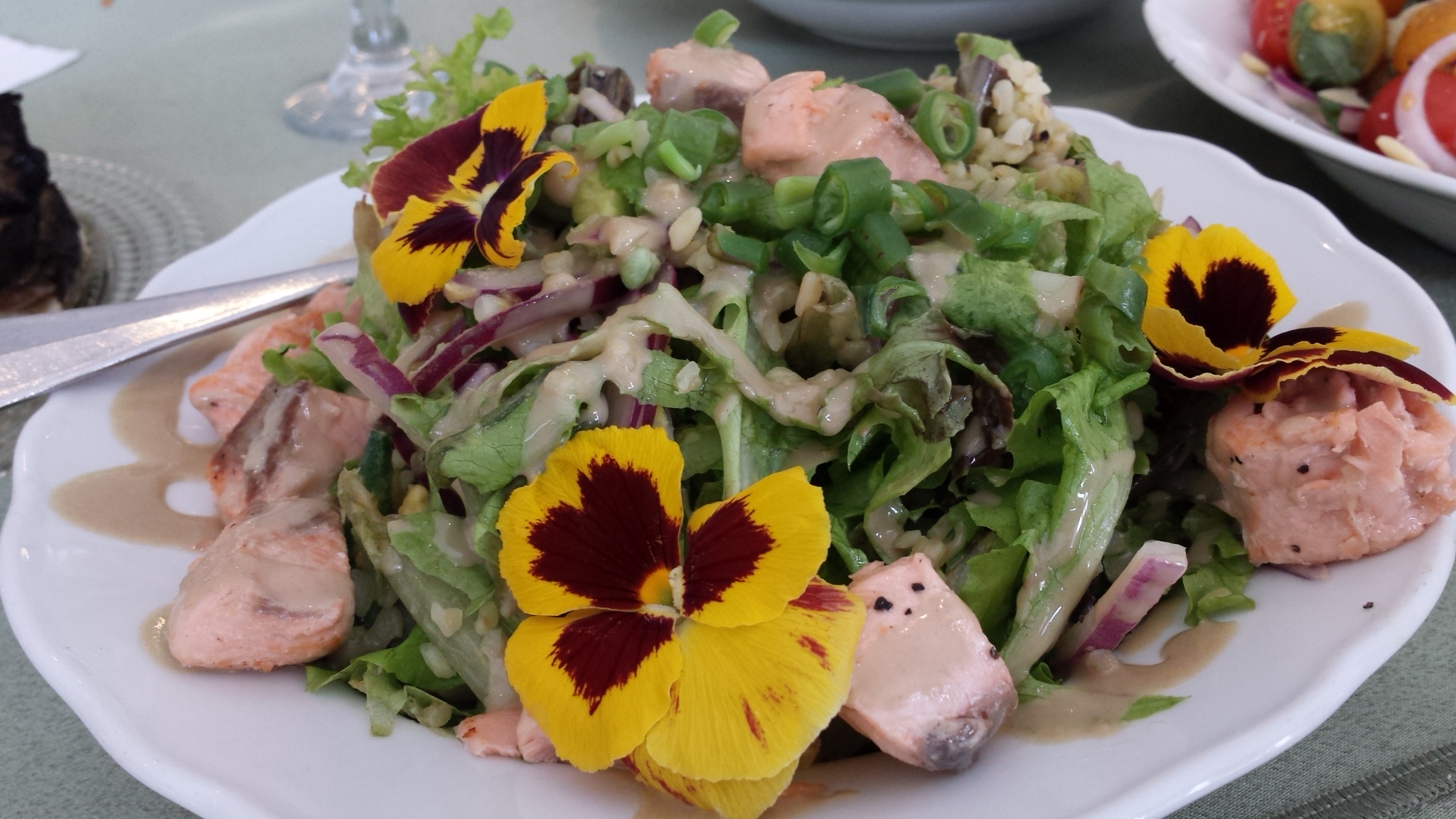 · סלט קוביות סלמון צרוב על תערובת עלים, שעועית ירוקה, אפונה, בצל, בורגול, אבוקדו )בעונה) וטחינה גולמית – סלט עשיר ומאוד טעים. הסלמון הוגש חם והורגש טרי. הכי טוב מבין הסלטים שטעמתי.