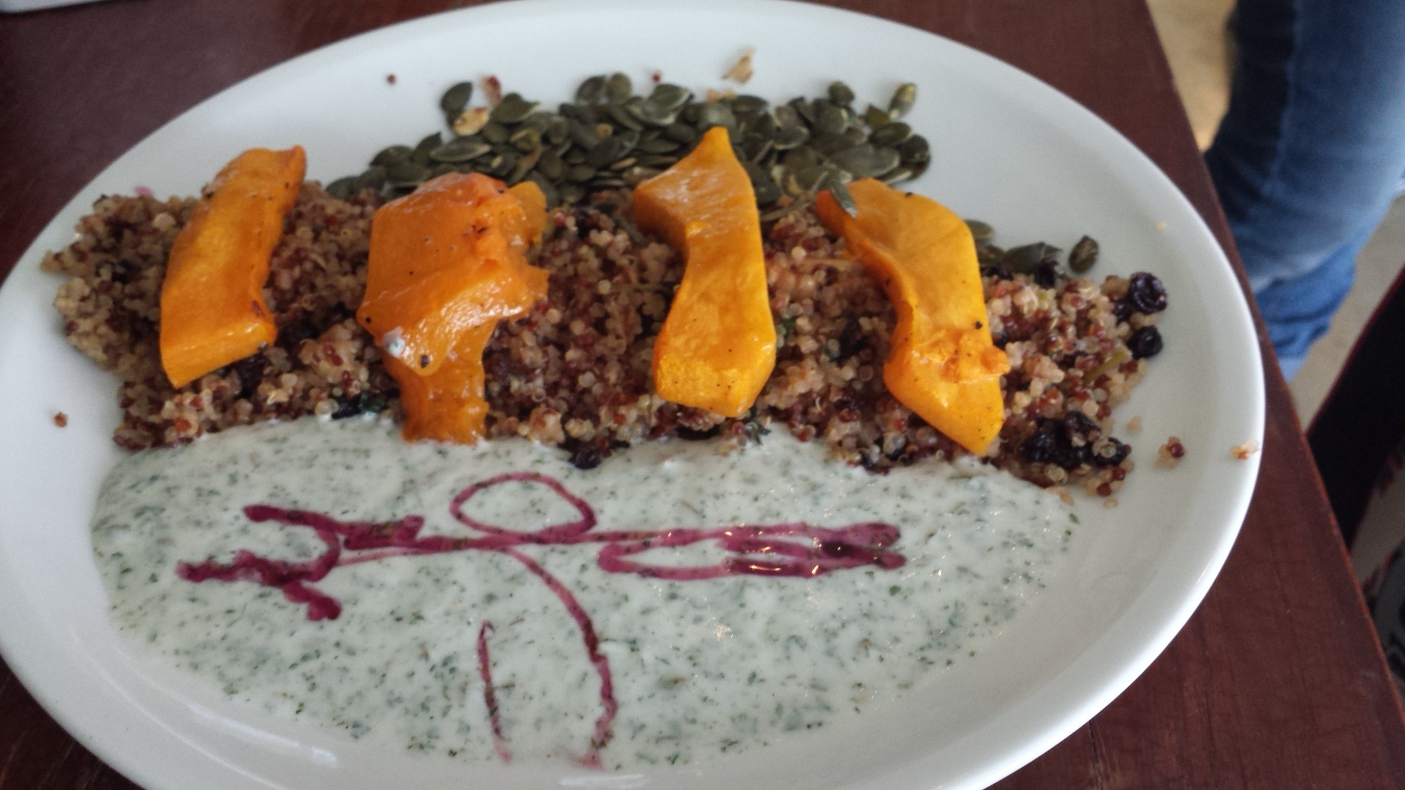 · תבשיל קינואה עם דלעת קלויה, אוכמניות ואגוזים, עם יוגורט ונענע – מנה צבעונית ומעניינת.