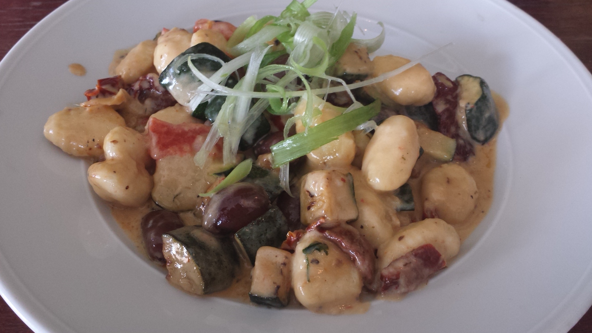 · ניוקי תפוחי אדמה על שמן זית עם זוקיני, עגבניות מיובשות וטריות, קלמטה, שום מתוק ונגיעת שמנת – עוד מנה טובה עם ניחוח איטלקי.