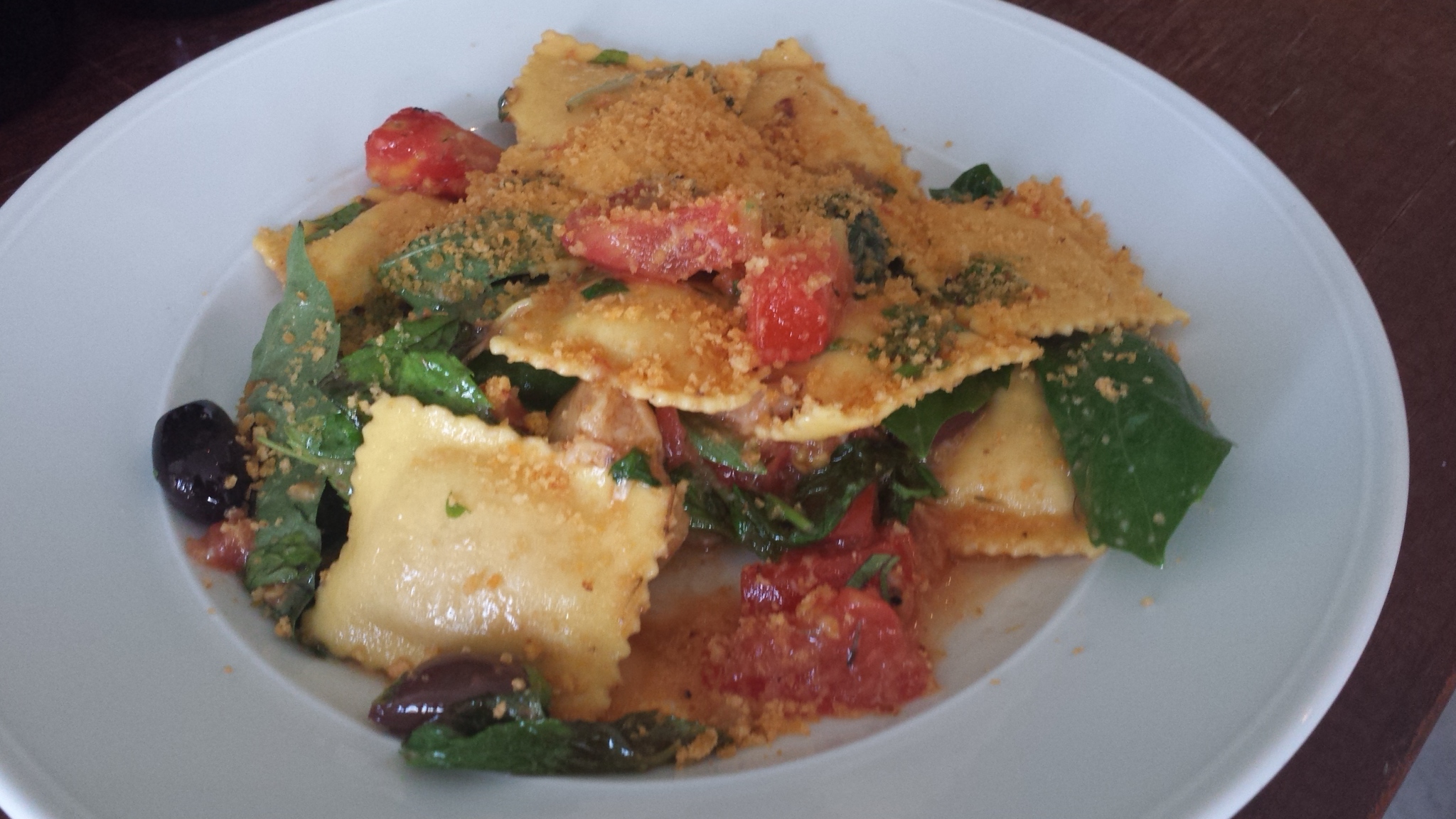 · רביולי בטטה עם ריקוטה, עגבניות, קלמטה, לימון, שום, בזיליקום, פטרוזיליה ונענע – מנה נהדרת.