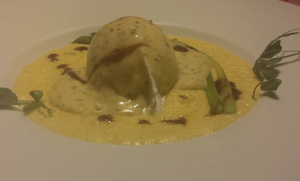 פולנטה – פולנטת תירס טרי, נגיעות בלסמי, פטריית פורטבלו צלויה, ביצה עלומה, אספרגוס חלוט, פרמזן ורוטב הולנדייז בזיליקום (47 ₪). התענגתי על כל כפית.