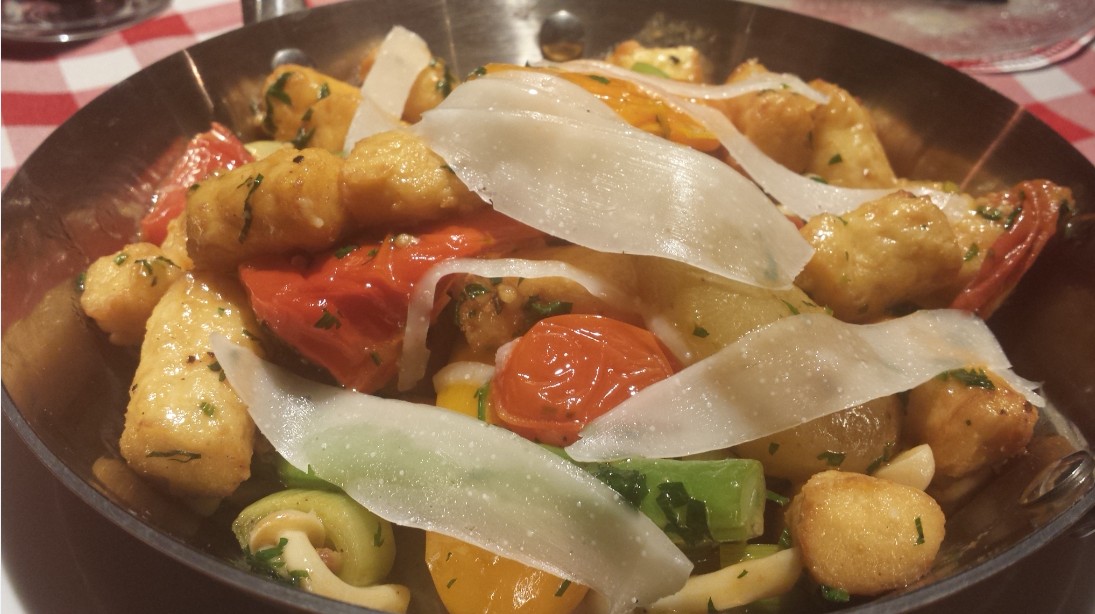 ניוקי גינה – ניוקי פריכים בליווי ירקות אנטיפסטי בחמאה – תפו"א, שעועית ירוקה , פטריות , עגבניות שרי ופלפל שושקה עם שבבי גבינת קצ'וטה (57 ₪). לא כ"כ אהבתי את הטוויסט האוורירי שעשו כאן לניוקי.