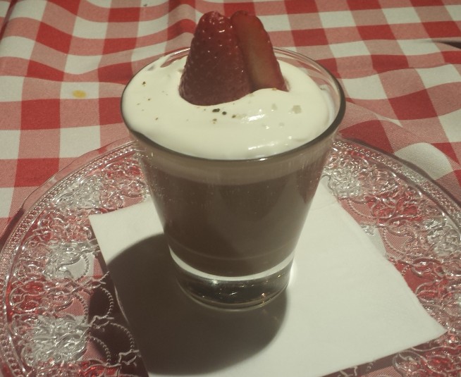 מוס שוקולד עם קציפת מסקרפונה – שוקולד מריר איכותי, קציפת מסקרפונה מומתקת קלות עם מלח ופלפל להעצמת הטעם (טעות! המלח והפלפל הרסו, ולמסקרפונה היתה חסרה מתיקות).