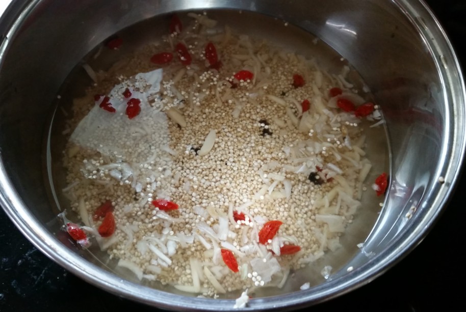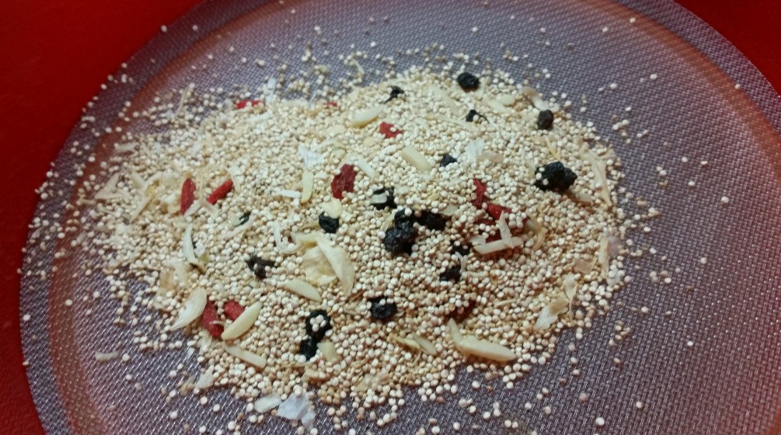 את תבשיל הקינואה הבוליביאני הכנתי בקלי קלות, מכיון שהוא מכיל כבר הכל בפנים (אוכמניות, גוג'י ברי, שקדים ובצל), רק צריך להוסיף מים ולתת לו להתבשל. והטעם – תענוג!