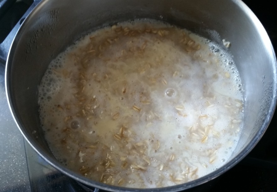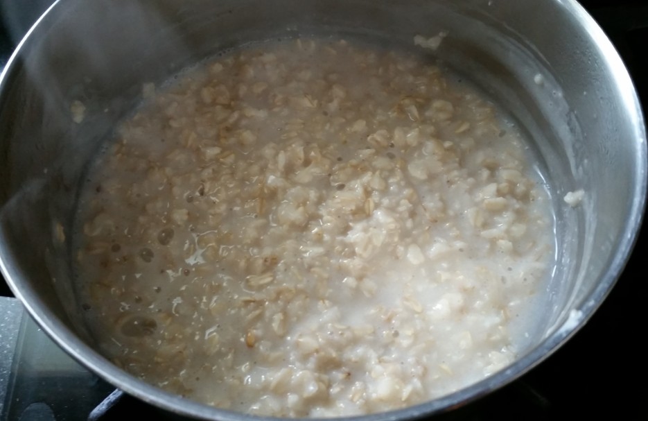 שמים בסיר 4 כפות שיבולת שועל אורגנית מלאות, מוסיפים מעט מים עד שרותחים, מנמיכים את האש, כשכל המים נספגים מוסיפים מעט חלב סויה ומחממים בערך עוד 5 דקות, עד שנהיית עיסה סמיכה.