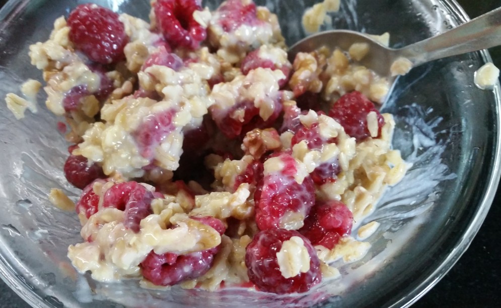 שמים בקערית פטל טרי/ אוכמניות/ תותים חתוכים, מוסיפים אגוזי מלך, קצת סירופ מייפל.