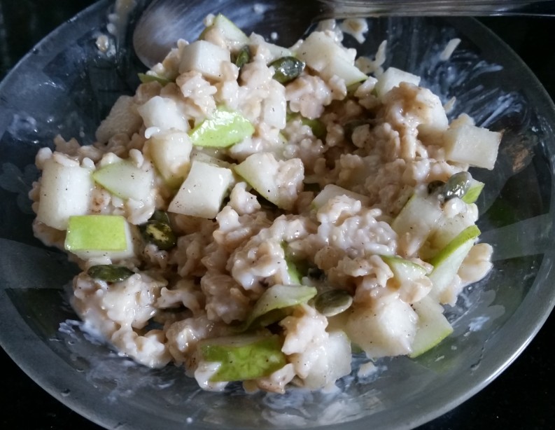 חותכים לקוביות אגס/ תפוח, מוסיפים גרעיני דלעת/ חמניה/ שקדים, מוסיפים קצת אבקת קינמון וסירופ מייפל.