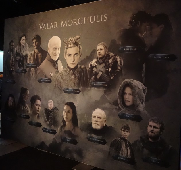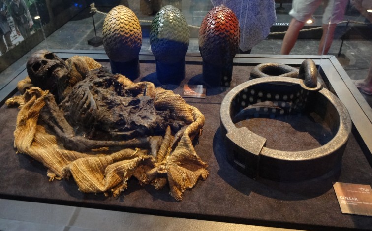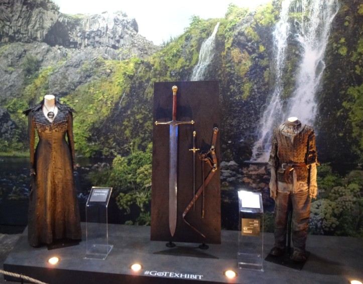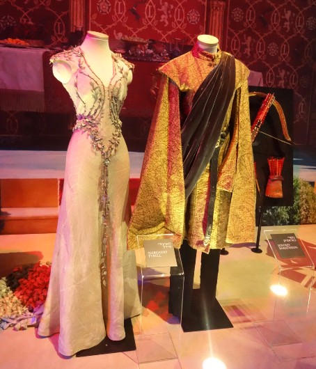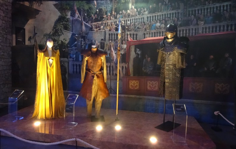 תלבושות, אביזרים, שריון, וכלי נשק – האוסף פרי ידם של אמנים, חרשים ובעלי מלאכה שיצירותיהם מקנות לסדרה אותנטיות, כולל מיצג תלבושות מרהיב של שריונות, שמלות, גלימות ותכשיטים, אביזרים אייקוניים שנבנו על הסט וביניהם דגם בגודל אמיתי של הלך לבן (White Walkers) דגמים של דרקונים, כלי נשק כגון חרבות, כידונים, שוטים, פגיונות, דגלי בתי המלוכה ועוד.