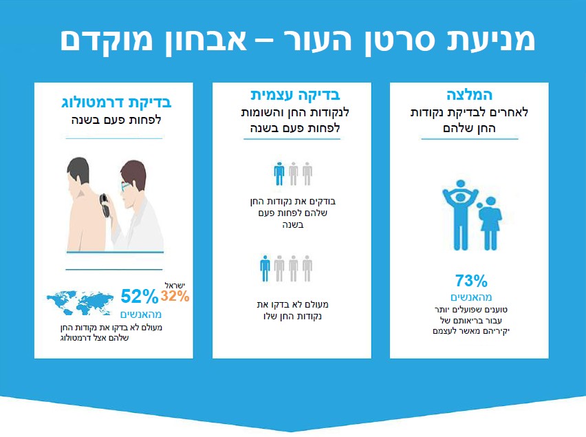 הנתון המדאיג אף יותר, הוא חוסר תשומת לב דרמטולוגית של מרבית הציבור להימצאותם של סימנים מקדימים לסרטן העור, שלעיתים קרובות הם גלויים לעין האנושית. רק 1 מ- 3 אנשים בעולם בודקים את השומות שלהם לפחות פעם בשנה ומעל למחצית האוכלוסייה לא עושים זאת ולא מעודדים את קרוביהם לעשות זאת בבדיקות סדירות, וזאת למרות הסיכונים.