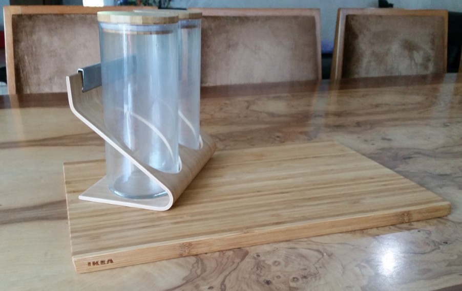 מדובר בקרש חיתוך עבה ואיכותי ושתי צנצנות גבוהות תואמות בתוך מעמד חינני במיוחד.